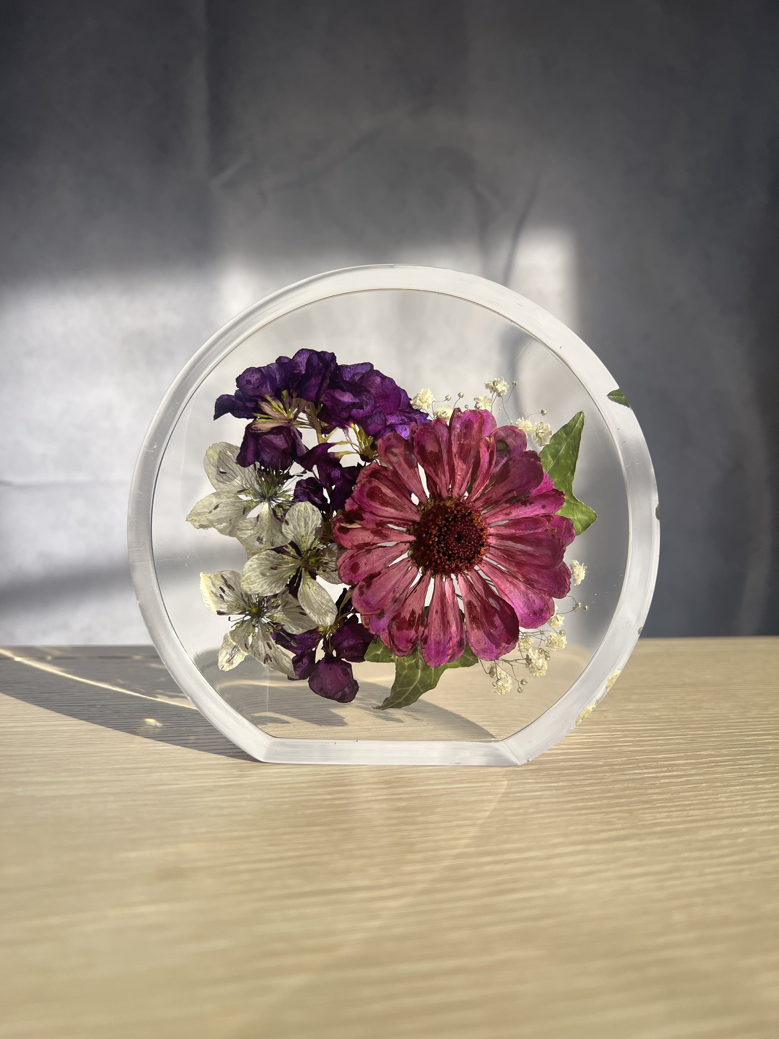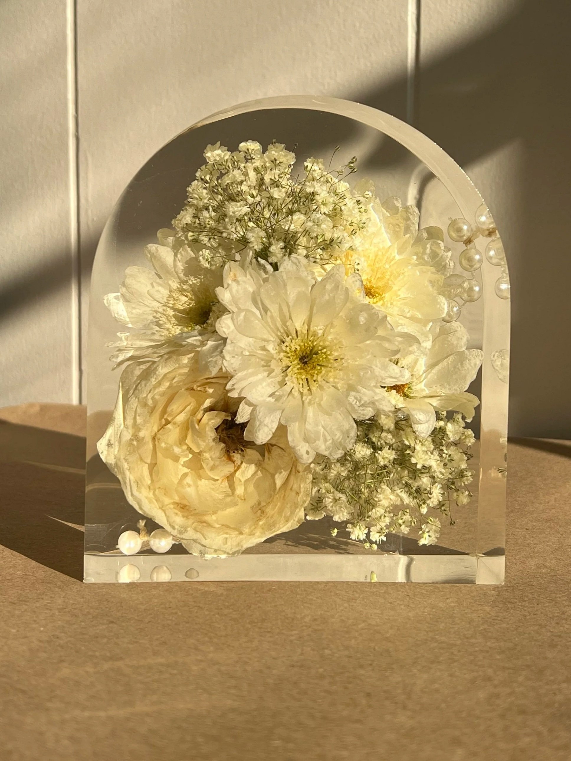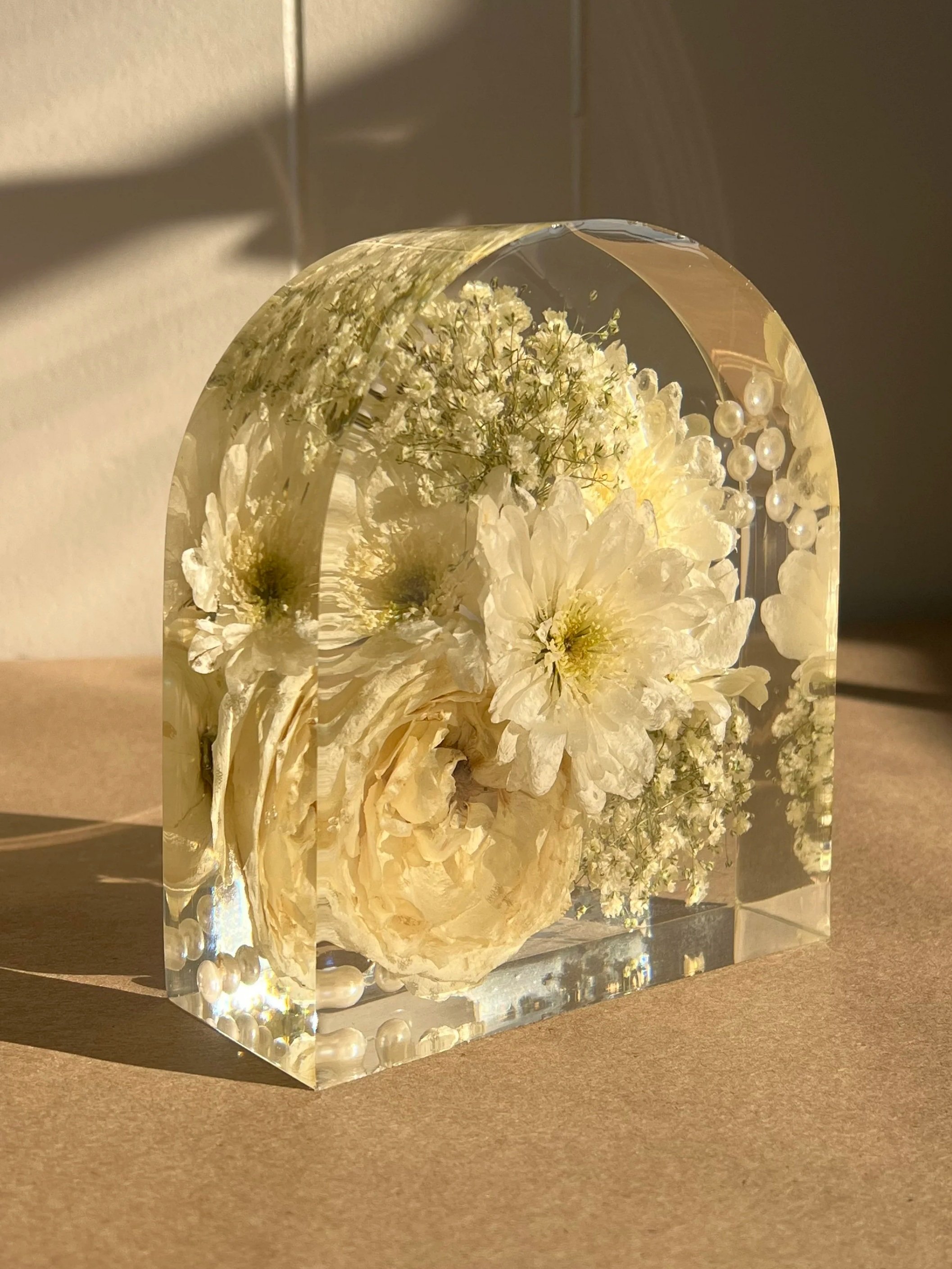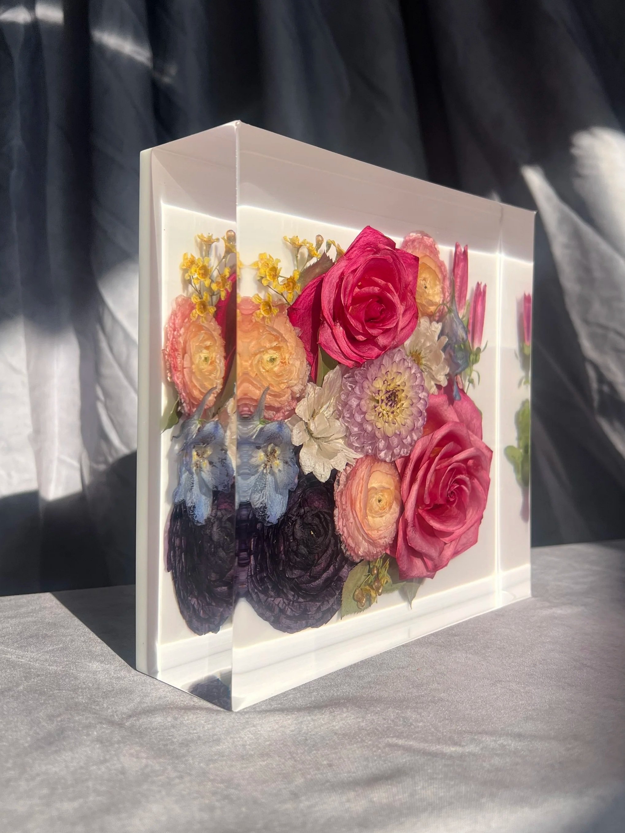 Curated Keepsakes are 2 inches deep or less resin pieces, making them perfect for preserving your smaller filler flowers, petals, and crushed “confetti” florals that accent your main piece beautifully.