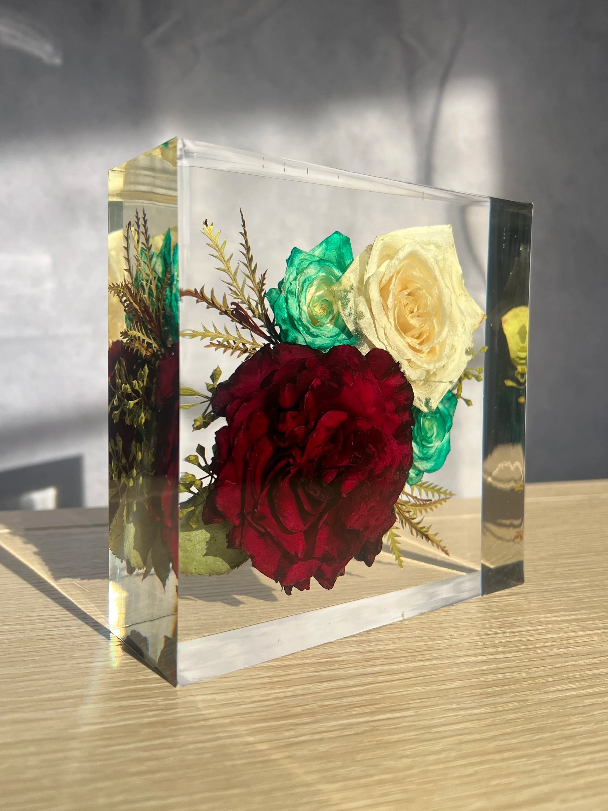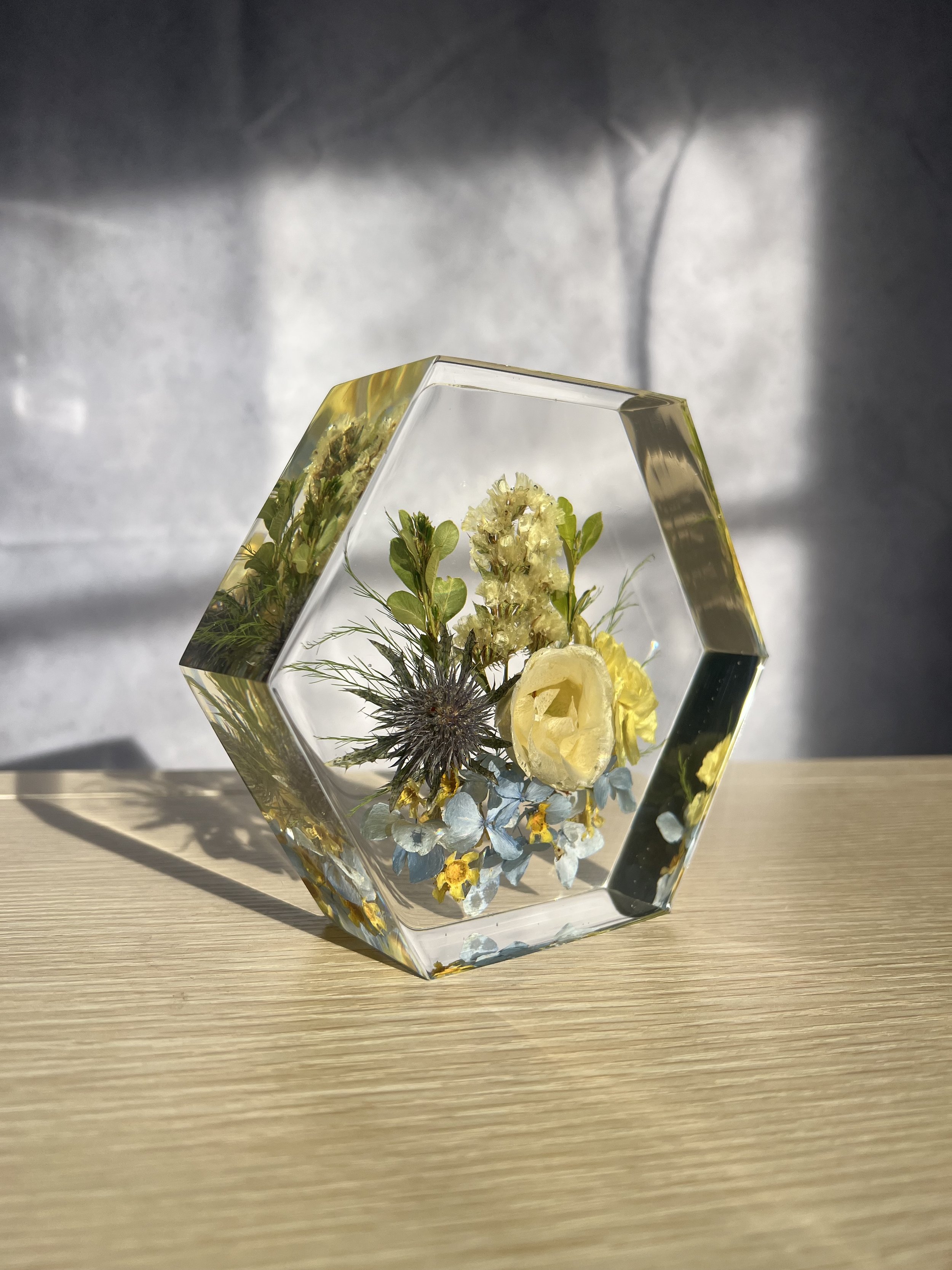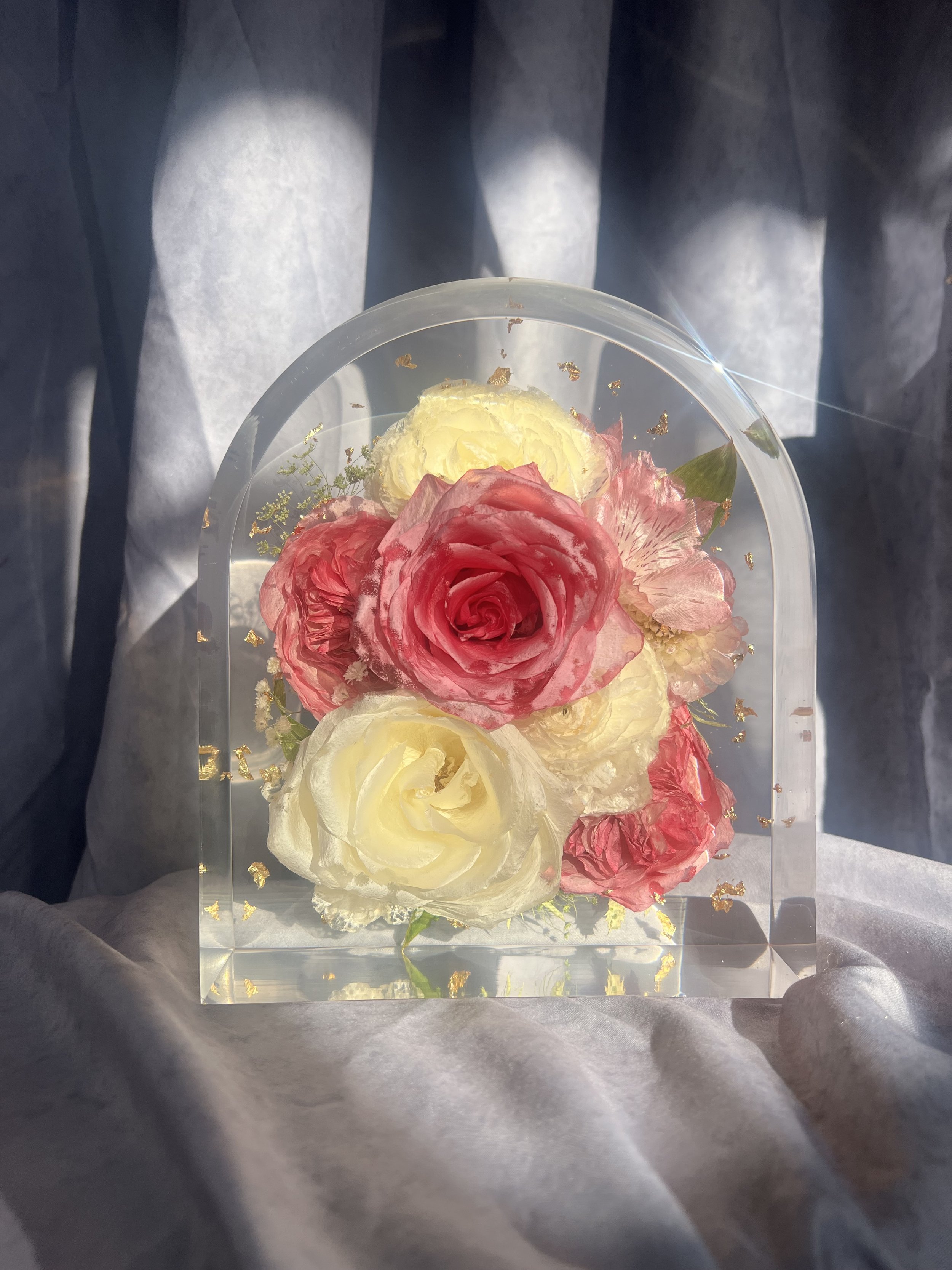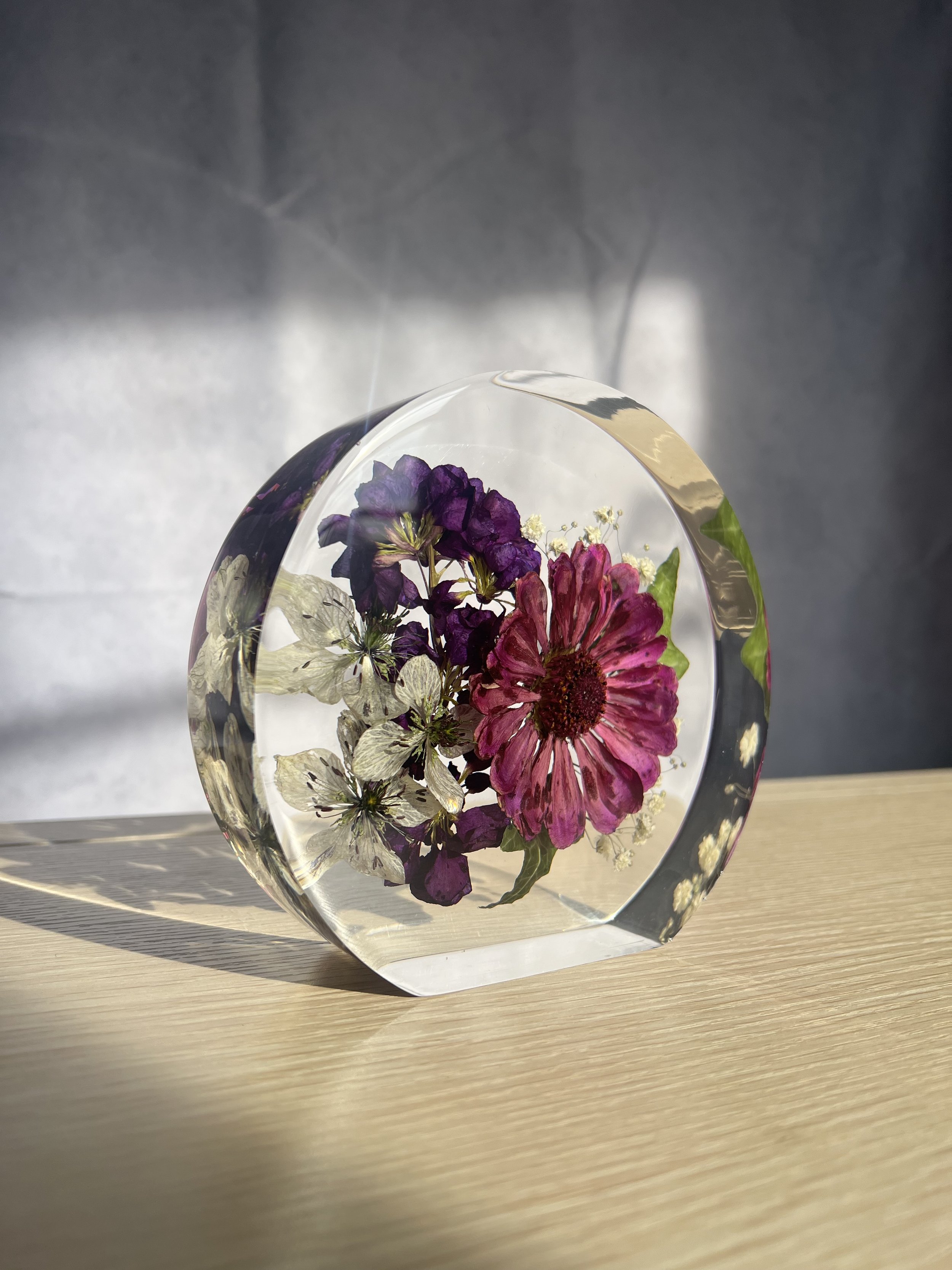 Curated Keepsakes are 2 inches deep or less resin pieces, making them perfect for preserving your smaller filler flowers, petals, and crushed “confetti” florals that accent your main piece beautifully.