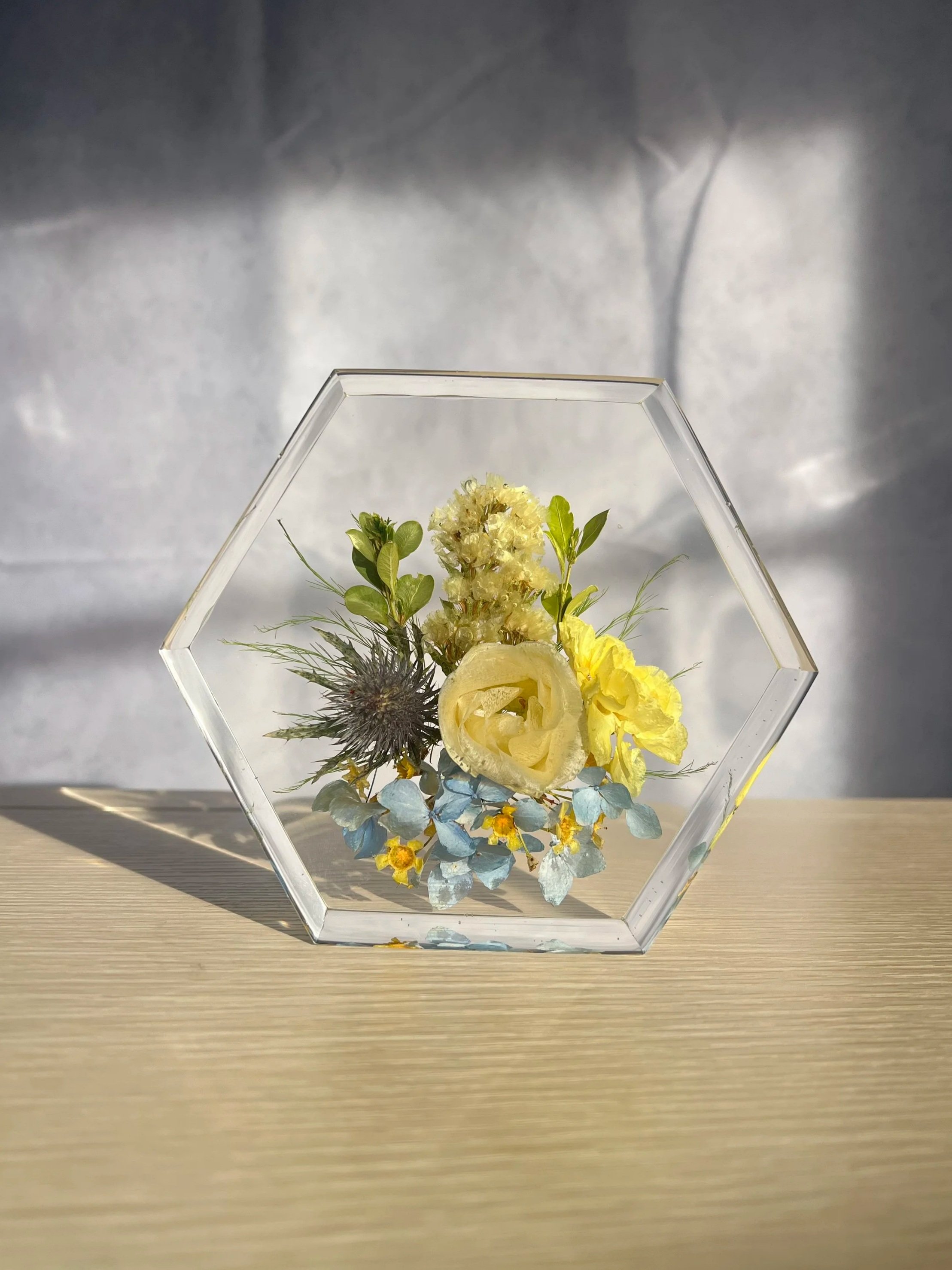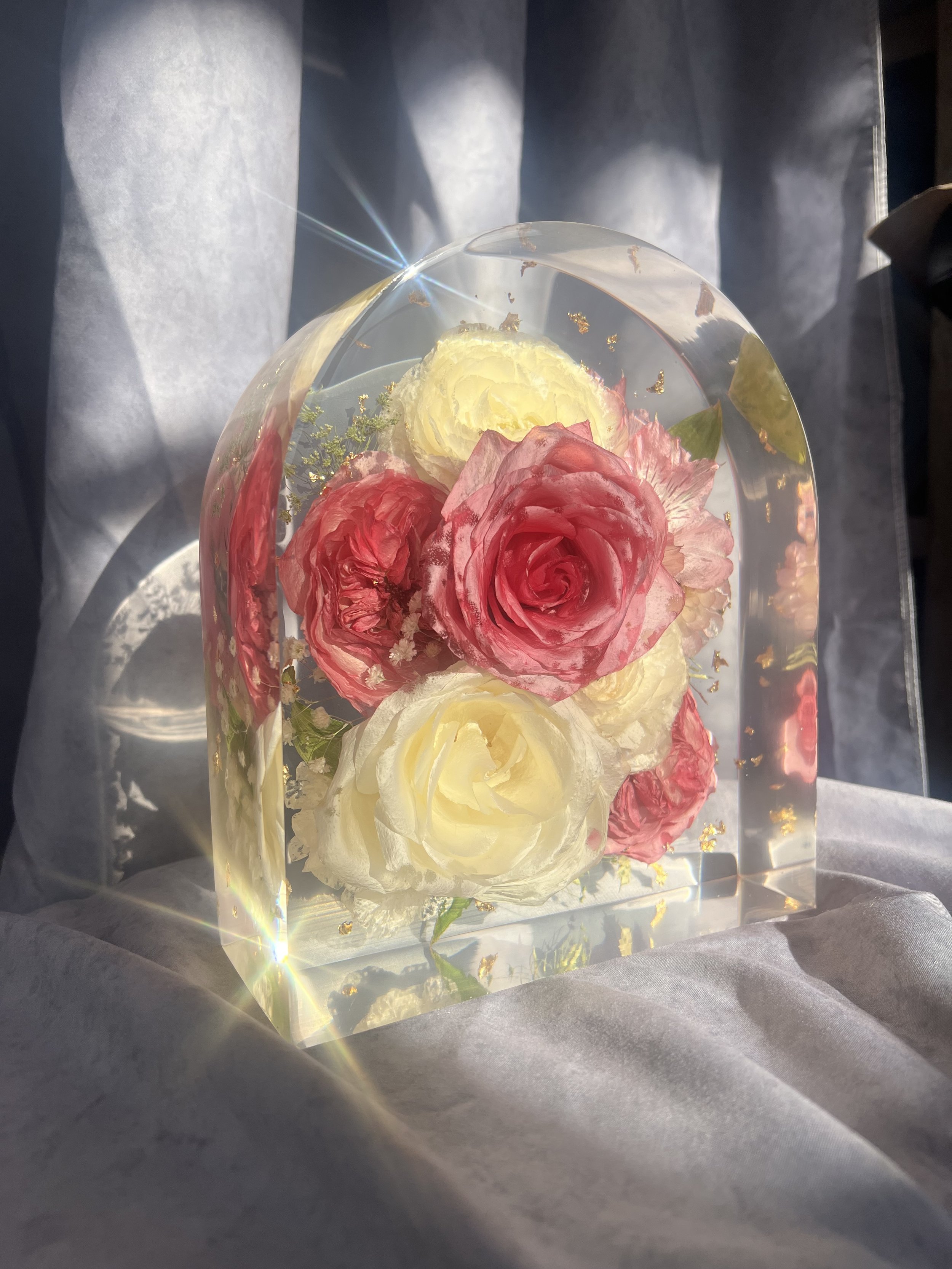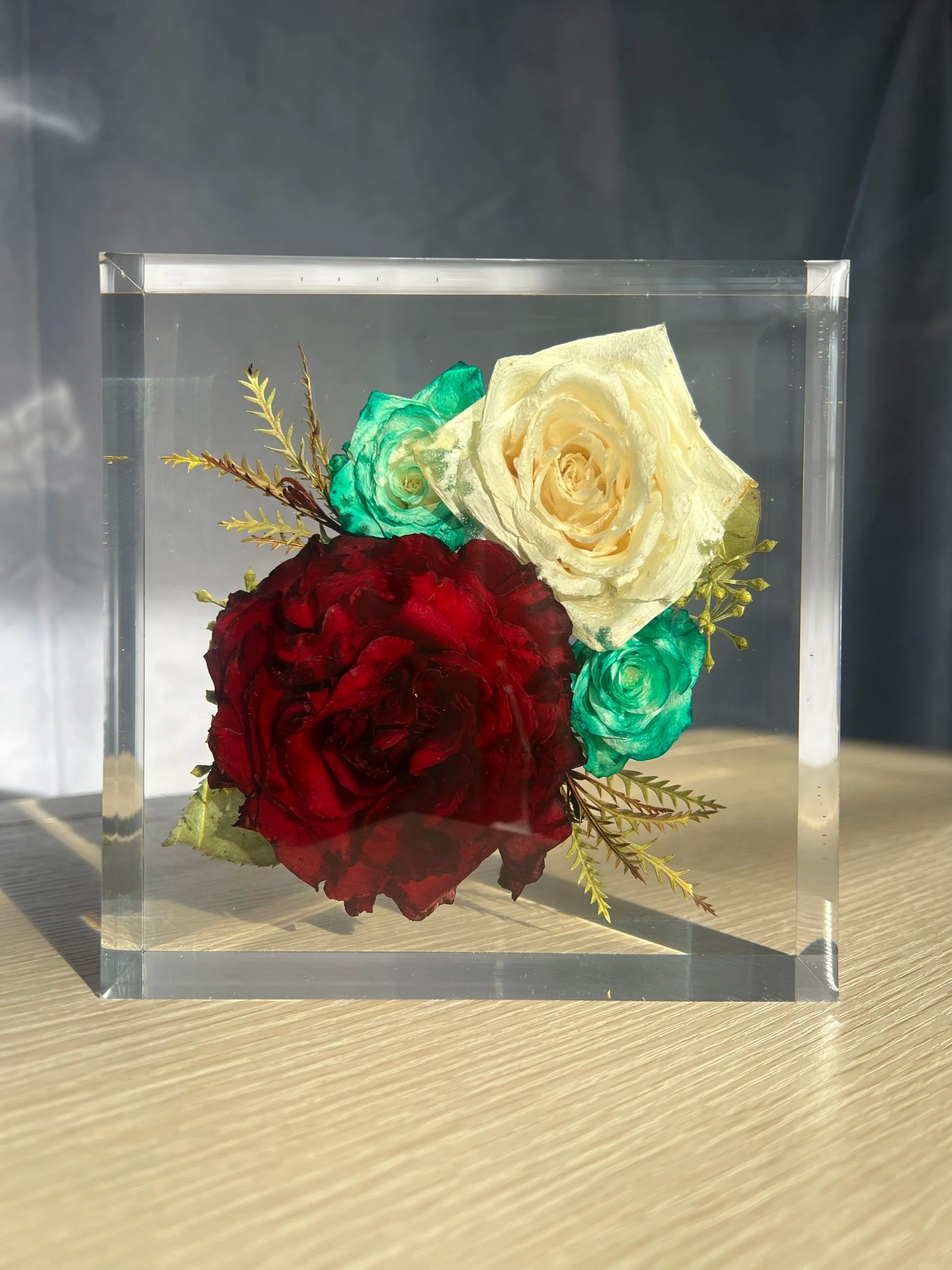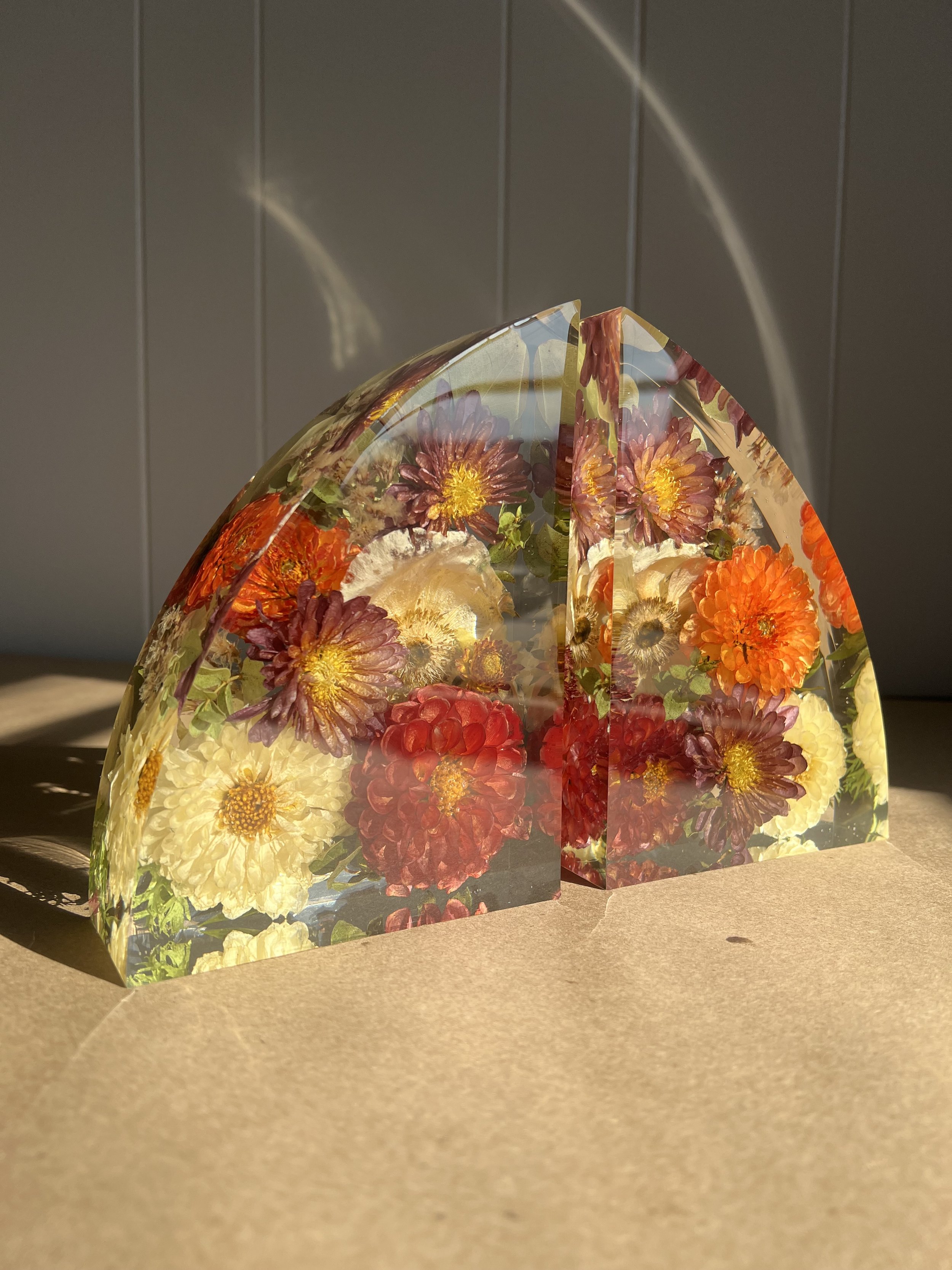 Curated Keepsakes are 2 inches deep or less resin pieces, making them perfect for preserving your smaller filler flowers, petals, and crushed “confetti” florals that accent your main piece beautifully.